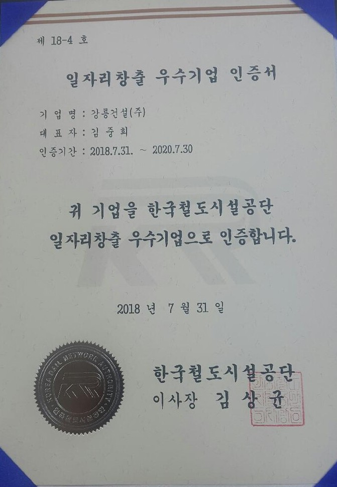 - 내 용 : 2018년 07월 31일 한국철도시설공단으로부터 일자리 창출 우수기업 인증서를 수상하였습니다.